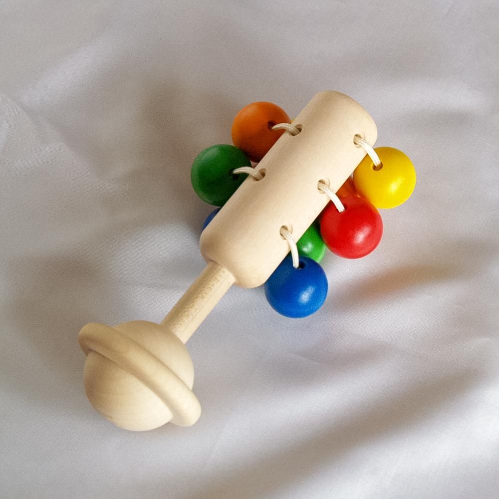 振って音を楽しんだり、舐めたり、かんだりとあかちゃんが試したい遊びが全部詰まったような素敵な赤ちゃん時期の木のおもちゃです。