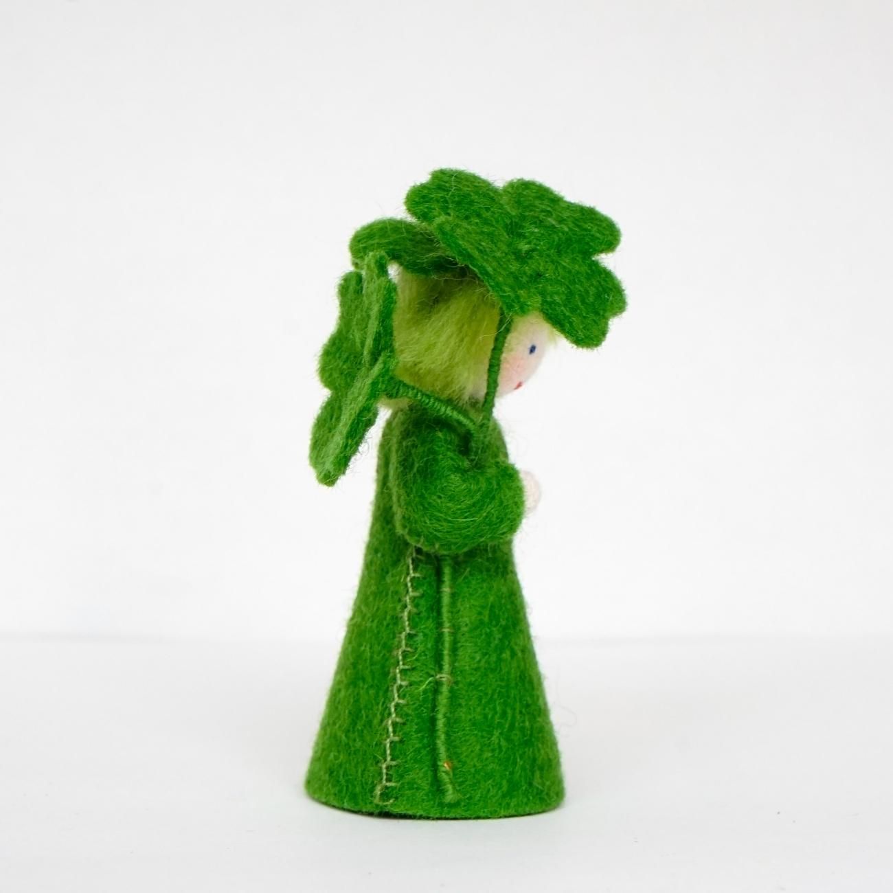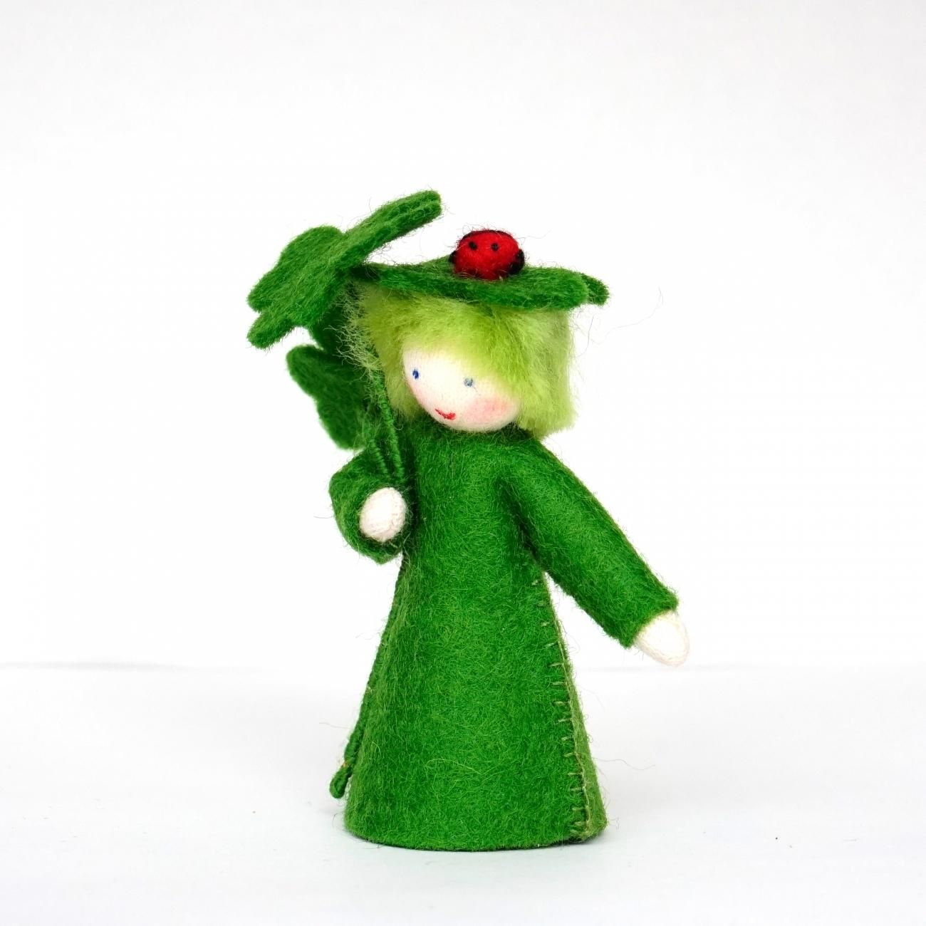 クローバーを手に抱えた妖精です、頭にはかわいいテントウムシがちょこんととまっています。