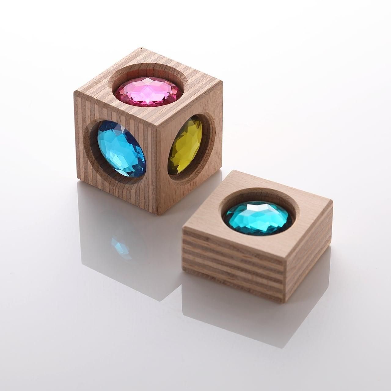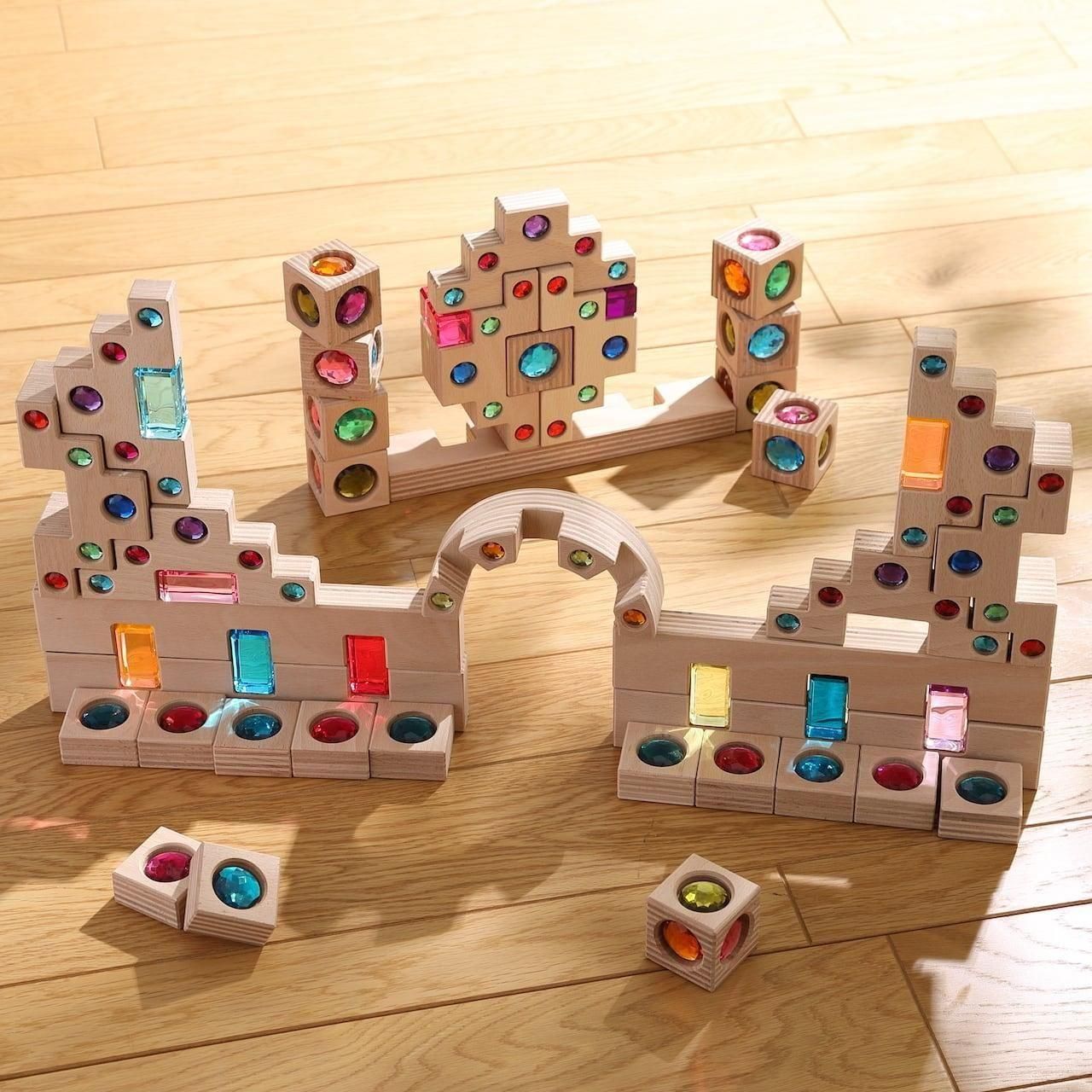 5cm基尺の積み木にアクリルでできた美しい宝石たちが煌めいています。